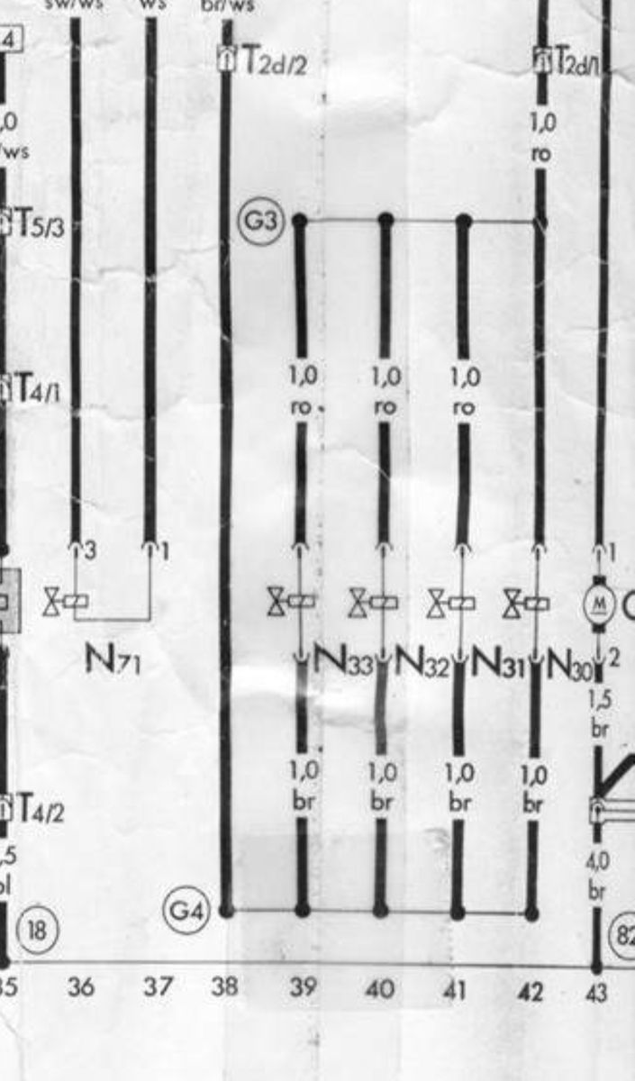 Ich bin gerade dabei die Einspritzung an meinem Cabby zu überprüfen. Mich hat dabei schon von Anfang an irritiert, dass die Verkabelung der vier Einspritzdüsen nur zwei-polig ist. Im beigefügten Auschnitt des Stromlaufplans sieht man auch dass alle Einspritzdüsen N30 bis N33 einfach parallel geschalten sind.