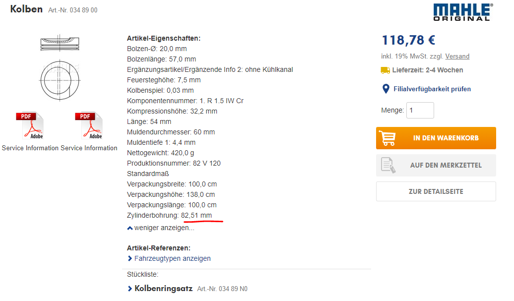 Und zwar bohrt man gleich auf 82,50mm oder 82,75mm auf, und zwar mit Kolben vom Audi 80 1,9 ( MBK: SD ) , vom Audi 90 2,3 ( MKB: NG ) oder vom 2,0er Hochblock-Motor aus dem Golf 3 GTI, Passat, usw mit 115 PS.
