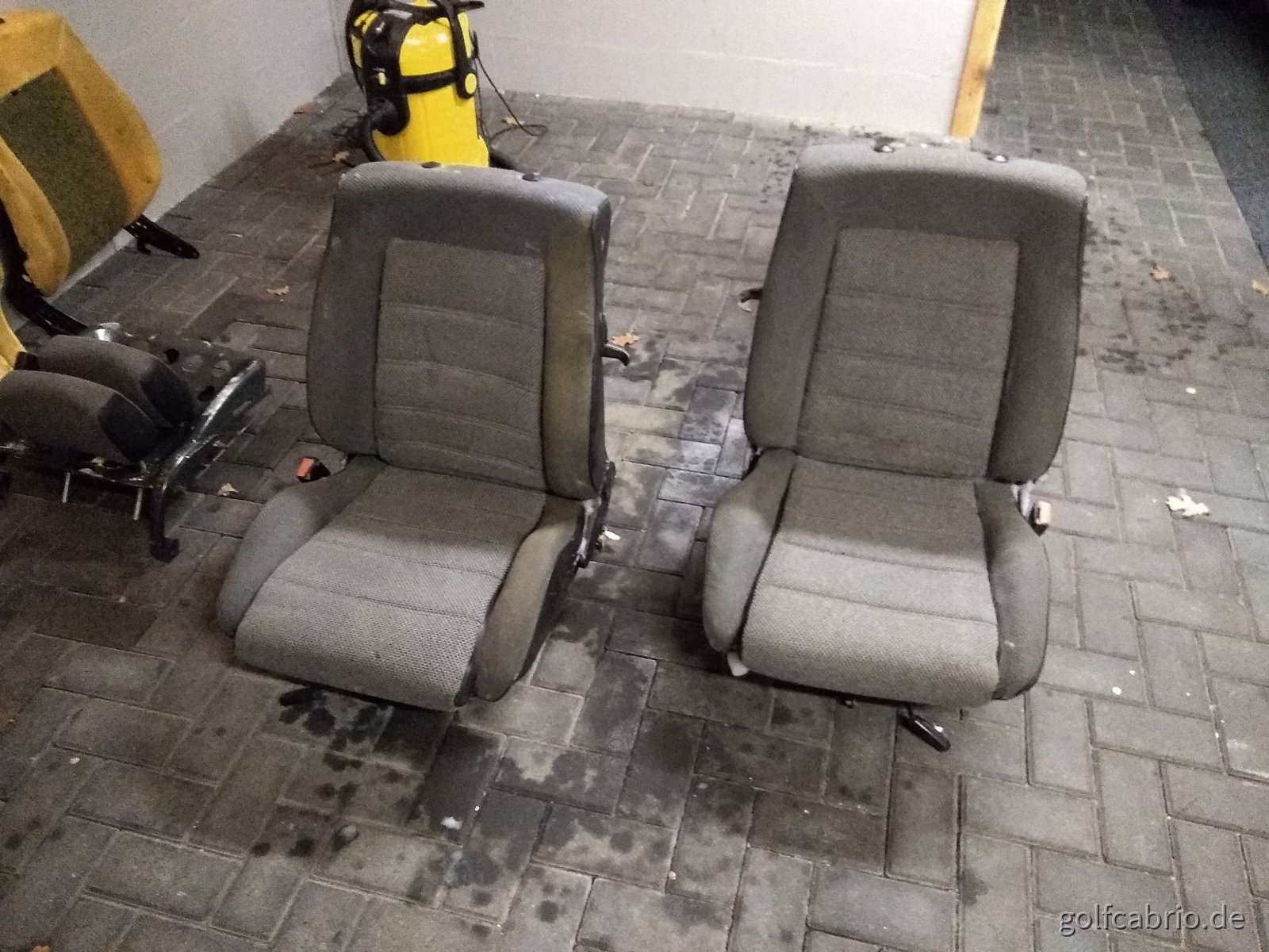 Die Sitze habe ich erst mal zum reinigen und aufarbeiten zerlegt. Der Stoff ist eigentlich in recht guten zustand. Am Fahrersitz guten die äußeren Wangen schon mal ersetzt. Da wurde im Prinzip sehr gute Arbeit geleistet, leider passt die Farbe nicht zum Rest. Werde versuchen da noch was passendes zu bekommen bzw. einnähen lassen, falls ich bei einem Sattler noch den passenden Stoff finde.