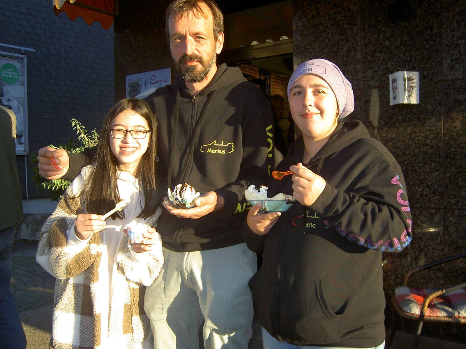 Ebenso kam ein E-Roller-Fahrer bei der Eisdiele vorbei - er hat nen roten Käfer und einen roten offenen 1er - wo wir wohl herkommen würden ? Fleissig zückte ich meine Karte (die ich mir von Peter leihen musste weil ich nicht genug dabei hatte) und er hat uns versprochen sich mal blicken zu lassen ![]()