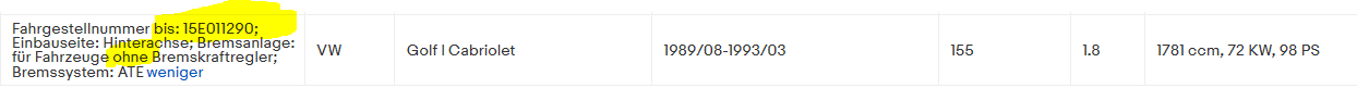 Schau mal hier. Angegeben Golf 1 Cabrio von 1979 bis 1993 incl. dem 2H. Aber die Dinger haben 14mm. Das ist definitiv falsch und bringt zu niedrige Bremswerte.
