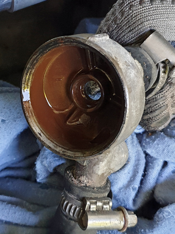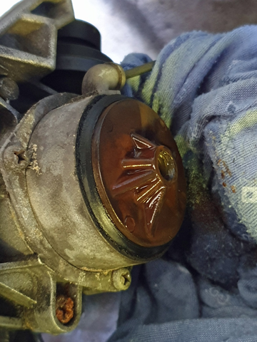 Es gibt eine Dichtung zwischen blau und gelb - die ist nach dem öffnen und 30 Jahre defekt. Tauschen, sonst tropft Dir da Kühlwasser raus. Die Schraube grün hat auch eine - wie es mit dem Adapter bei Dir aussieht weiß ich nicht.
