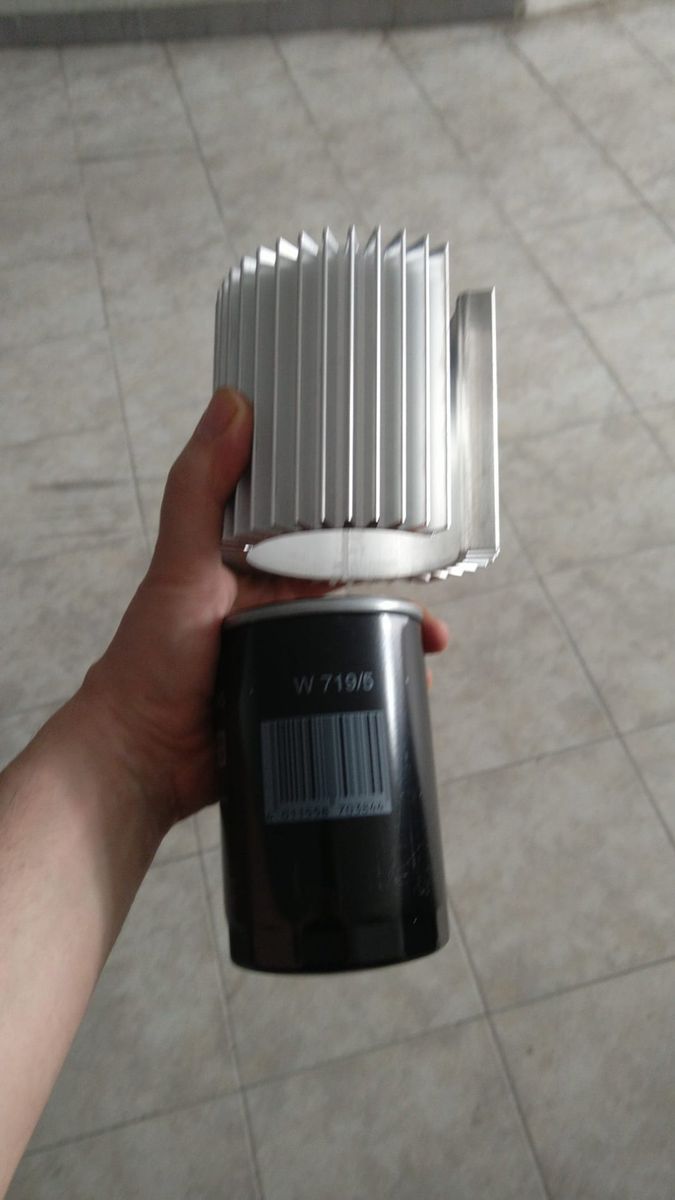 Ich kaufte einen Kühlkörper aus Aluminium und formte ihn in der Hydraulikpresse so, dass sein Innendurchmesser dem Außendurchmesser des Ölfilters entsprach.