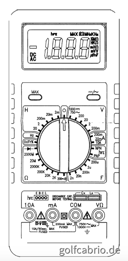 Da der zu erwartenden max Wert lt. Tabelle ein 1000 Öhm ist, stellst Du das Messgerät unten links bei 7... 8 Uhr auf 2k.