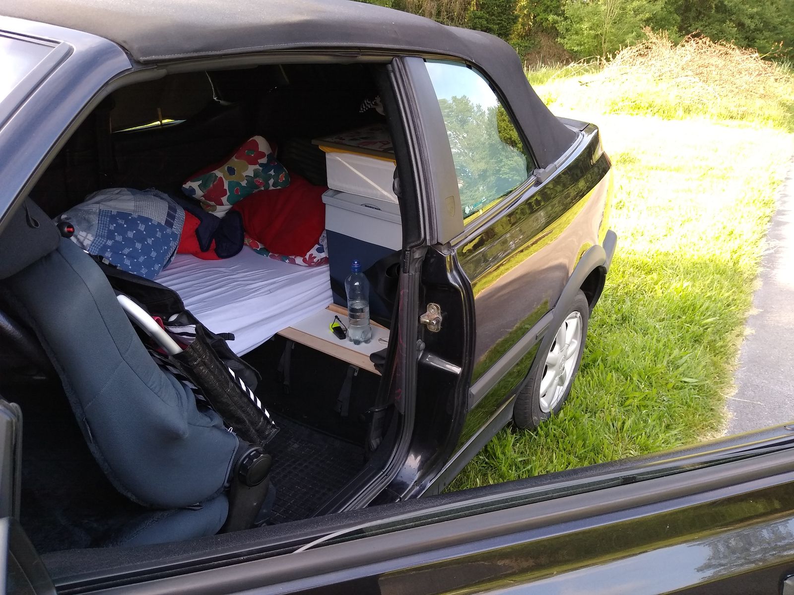 Eine verrückte Idee schoss mir in den Kopf,- "bau dir doch ein Bett ins Auto". Die näher liegende Variante wäre eigentlich ein Bett in unserem Volvo Combi gewesen, aber nein - ich liebe mein Cabrio und das besondere Fahrgefühl. Vor allem schöne Landstraßen bei gutem Wetter - ich sag´immer "das ist wie Kutsche fahren". Mit Hilfe von Youtube-Videos habe ich meinen Beifahrersitz und die Rückbank ausgebaut und konnte erst dann ausmessen, ob die Länge für mich reichen würde. Um es abzukürzen, - es reicht. Nach ein paar Bastelleien und Tüfteleien, die mir einen Heidenspaß gemacht haben, wurde mein Projekt Wirklichkeit. Und ich war nun auch schon 3 Wochen lang mit meinem neuen, kleinen Cabrio-Womo unterwegs. Mein Fazit ist: Das war noch besser, als mit dem Zelt. Totale Freiheit. Keine Sorgen darüber ob es regnen könnte und ich dann ein nasses Zelt einpacken muss usw. Ein großer Vorteil ist, dass ich nicht mehr auf dem Boden herumkrabbeln muss und das Beste ist, dass ich bei offenem Dach dann auch gleich meinen super bequemen Liegestuhl habe und nicht erst groß irgendwelches Mobiliar aufbauen muss. Außerdem falle ich als Camperin überhaupt nicht auf,- außer auf dem Campingplatz ![]()