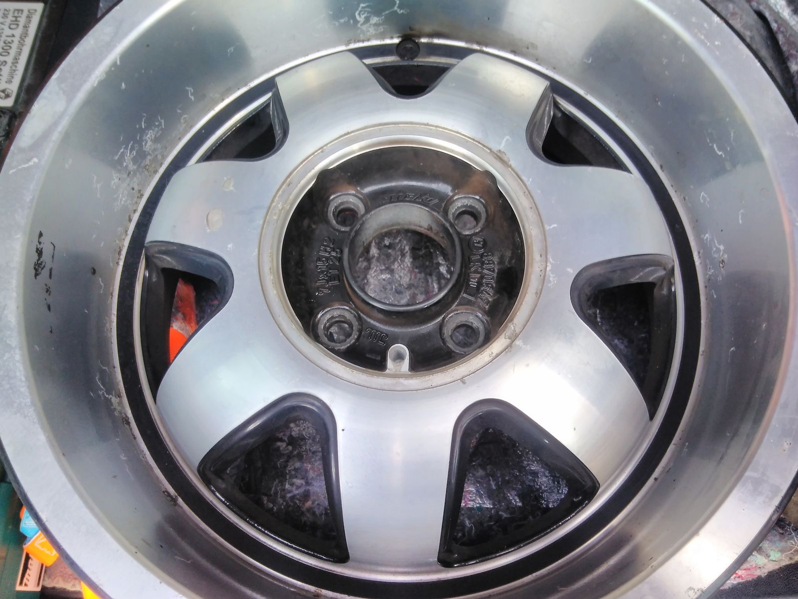 Habe aber auch von dem damaligen Verkäüfer noch 2 Sätze Alufelgen, teilweise im desolaten Zustand dazu bekommen. Siehe Foto von Strato Felge im Urzustand und montiert.