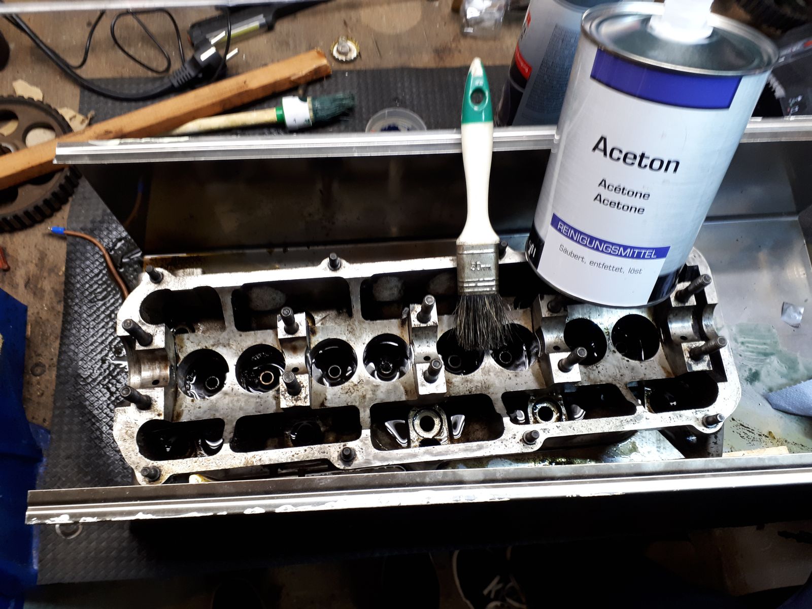 Hat jemand ne idee wie ich diese festgebrannten Ölrückstände unten im Zylinderkopf weg bekomm.Mit irgendwelchen Bürsten komm ich da nicht ran. Ich hab's schon mit ner ganzen Dose Bremsenreiniger probiert und ausgekärchert hab ich ne auch schon. Welches Mittel nutzen die Motoren Instandsetzer in den Teilewaschmaschinen, das scheint ja zu funktionieren.
