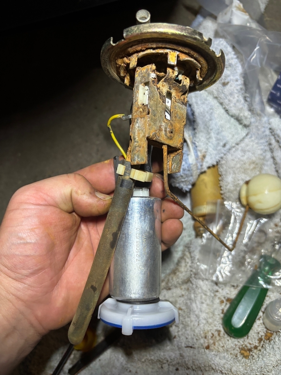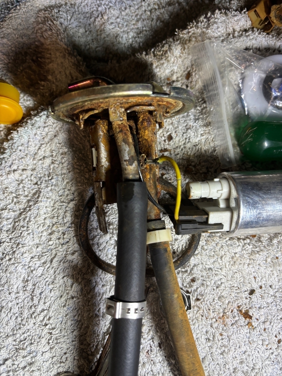 Zu allem Überfluss hatte ich vor ca. 2 Wochen noch starken Spritgeruch am Auto. Ursache war schnell gefunden: der Reduzierschlauch zwischen S-Rohr und Hauptpumpe war so dermaßen porös - der war schon vällig getränkt von Sprit in allen seinen aufgerissenen Poren. Also schnell 10mm-Cohline bestellt und den auf den 11mm-Anschluss gewürgt. Dann mich dem eigentlichen Problem gewidmet: