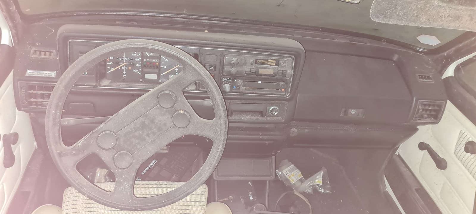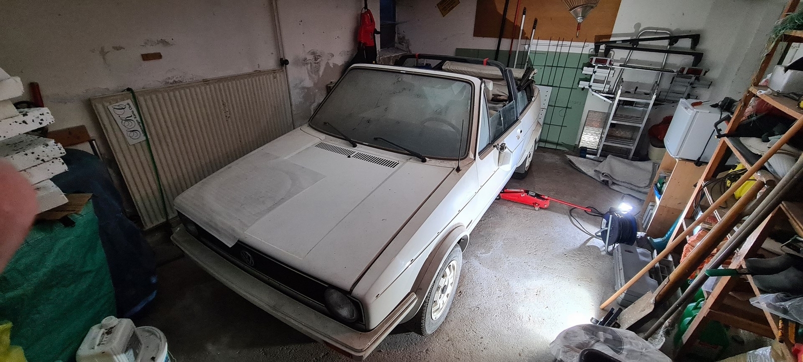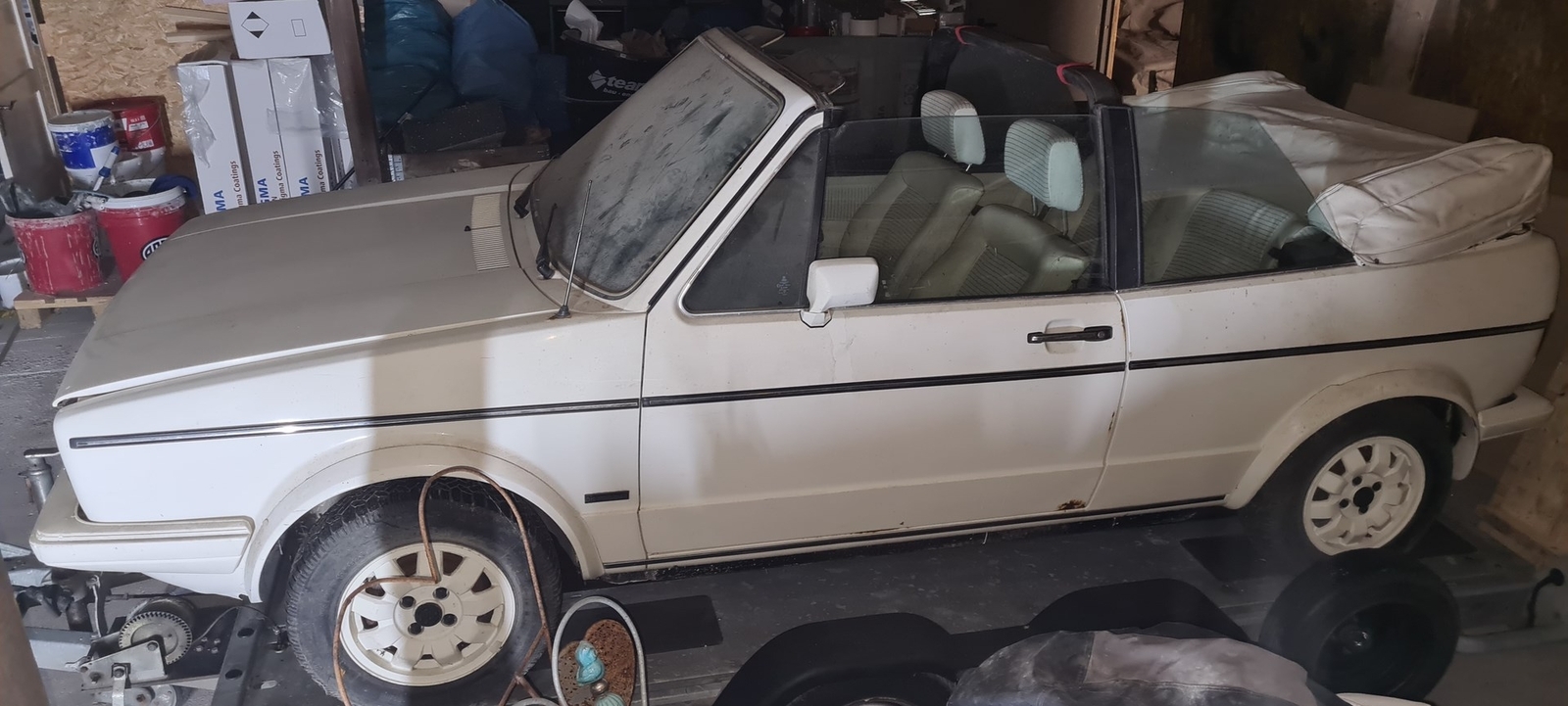 ca. 25 Jahre (1997) stand das Cabrio in der Garage bei einem älteren Herrn hier bei uns im Dorf und nun sollte es weg..... kurz und knapp hatte ich mir das Cabrio angeschaut und schnell zugeschlagen, da Preis und Zustand mehr als Fair war. Leider stand er die zweieinhalb jahrzehnte mit offenem Verdeck, das ist bei Schliss komplett zerbröselt, und vom gestänge bis zum Scheibenrahmen fehlten gut 3cm.... hoffe nicht das dass Gestänge verbogen ist.