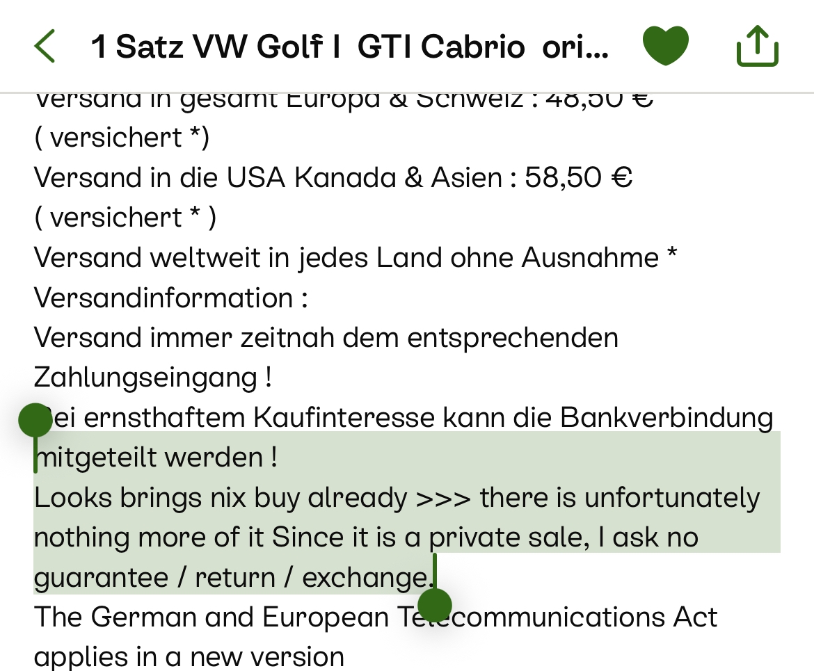 "Aussehen bringt nichts, aber es gibt leider nichts mehr davon. Da es sich um einen Privatverkauf handelt, bitte ich um keine Garantie / Rückgabe / Umtausch."