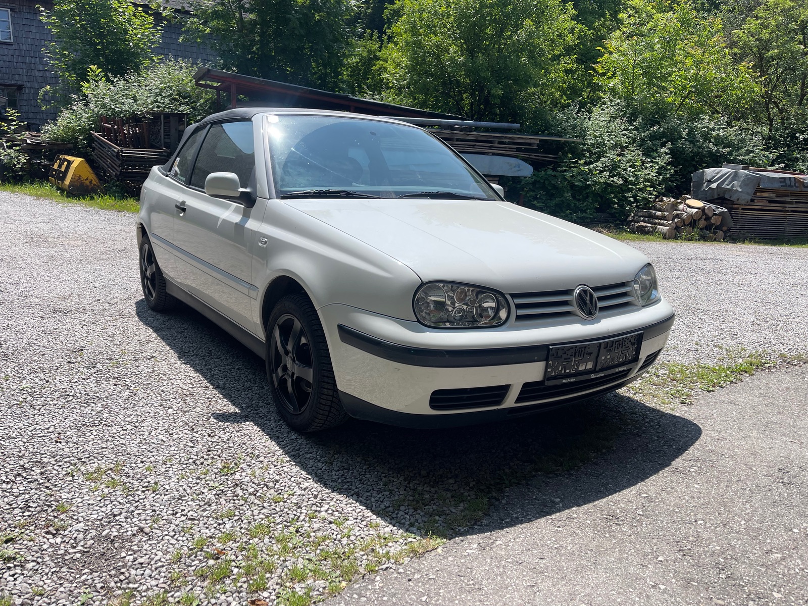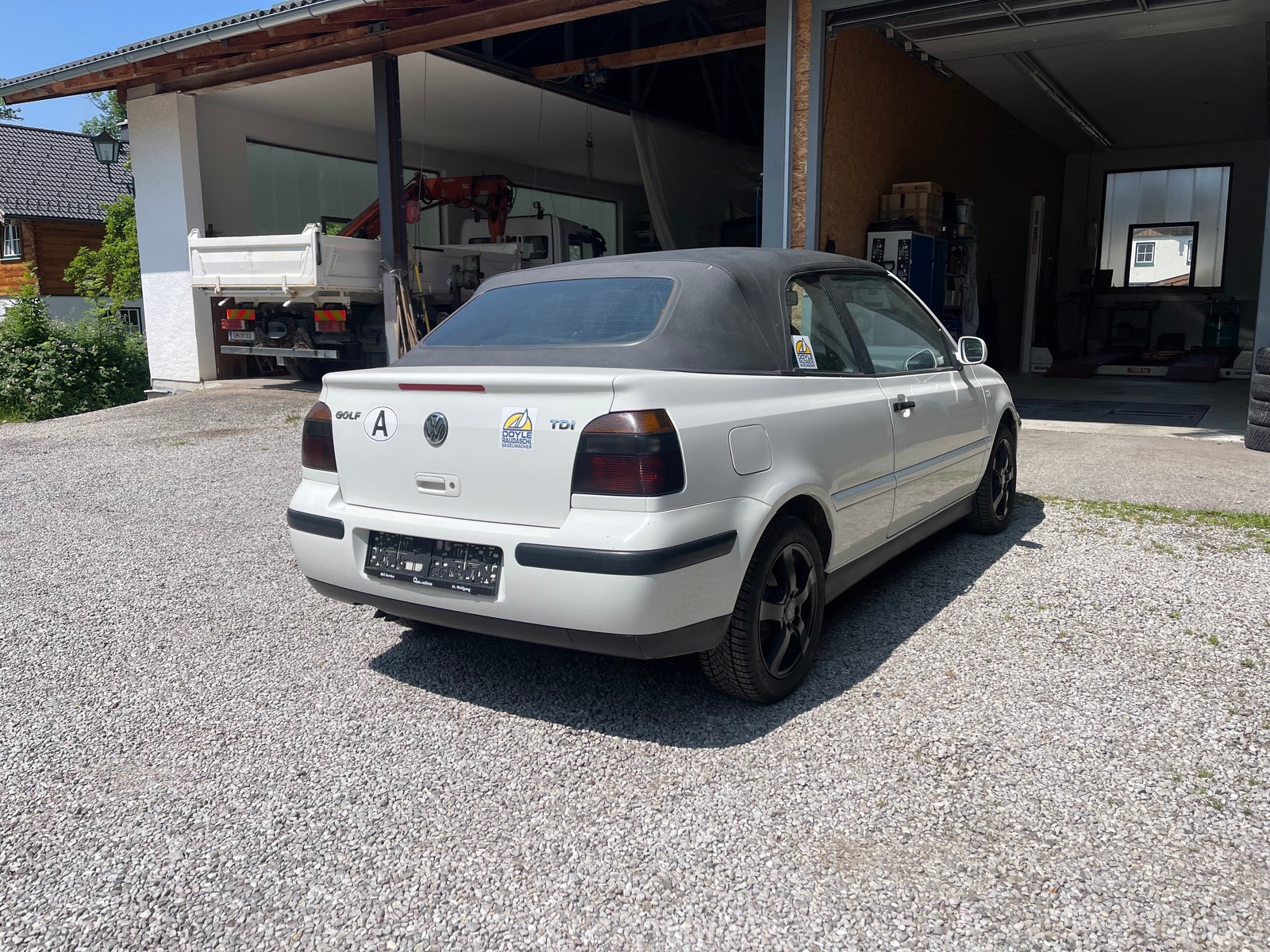 Golf 4 Cabrio, basierend am 3er TDI mit 90 PS, 160000 km, rostfrei, weiß, Lack ist okay, gehört nur an ein paar Stellen (Türstoßleisten, Türkante Fahrerseitig) etwas ausgebessert und komplett aufbereitet. Elektrisches Verdeck ist perfekt.