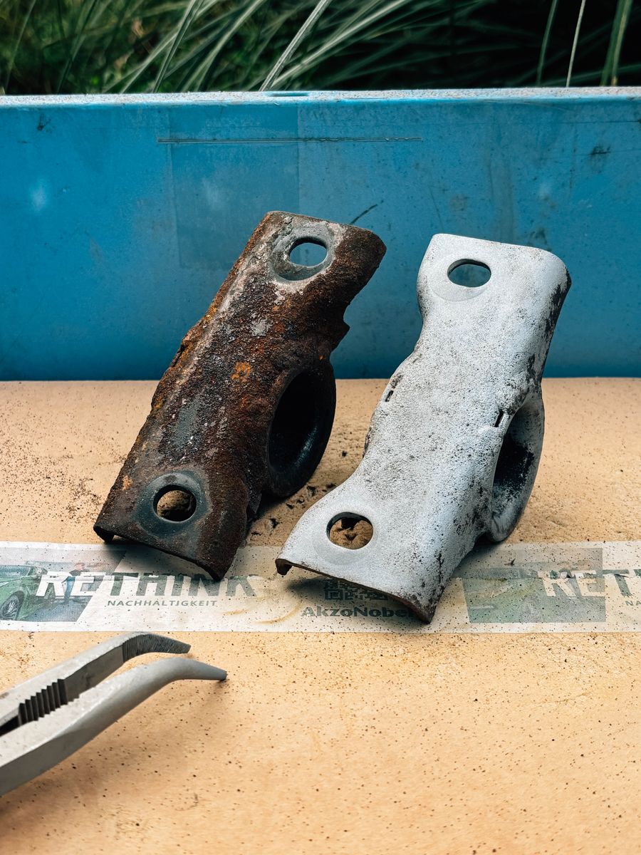 Obwohl die Karosserie so gut wie keinen Rost hat, sahen alle Fahrwerksteile flächendeckend aus wie ein nahezu perfekter Brownie. Zum Glück habe ich in der Firma meiner Eltern noch ein primitives Sandstrahlgerät gefunden. Bremssättel, Bremsankerplatten, Achsschenkel, Tankhalter-Clips und alle möglichen anderen Teile konnte ich damit aufarbeiten, anstatt neue kaufen zu müssen.