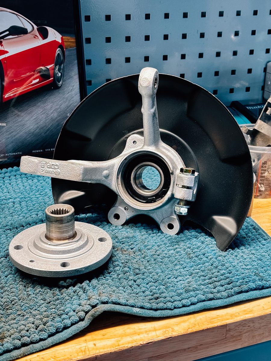 Vielversprechend! Den nicht benötigten Zapfen haben wir dann ohne seine Welle ins Auto gesteckt, damit wir das Auto immerhin auf seine Räder stellen können, ohne das Radlager zu zerdrücken: