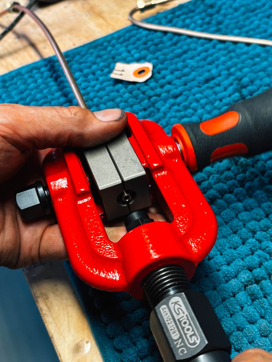 Neue Bremsleitungen gabs auch! Hätte nicht gedacht, dass das eine der spaßigsten Tätigkeiten wird. Ich bin heilfroh, all diese Sachen nicht in meiner eigenen Garage machen zu müssen.