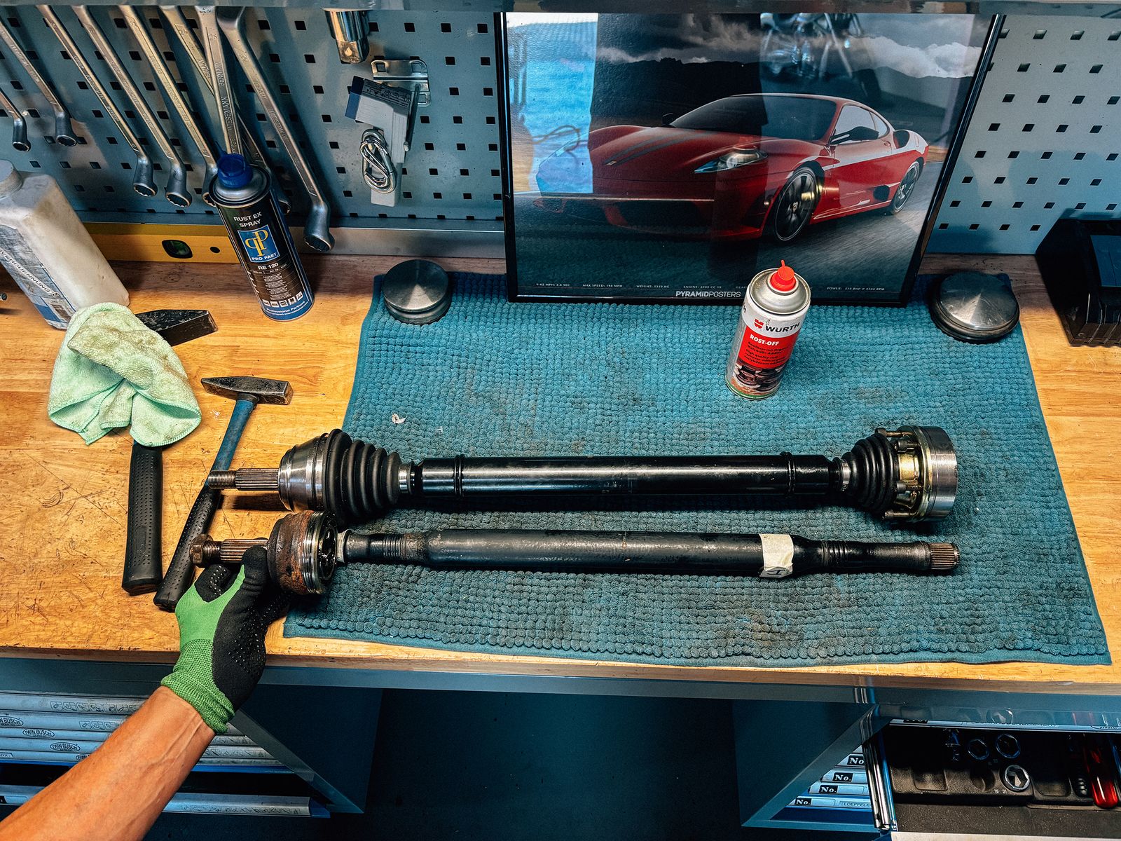 Mist, das wars nicht. Oder besser, yeah!, das wars nicht! Also wieder heim, und den Ersatz-Achsschenkel aus dem Schlacht-Auto eingesteckt. Und siehe da, das brachte fast drei Grad! Während ich den Achsschenkel wieder ausbaute, um ihn mit dem Sandstrahler zu Leibe zu rücken, nahm mein Dad schon mal die Antriebswelle in Augenschein. Ich kam wieder in die Garage zu folgendem Anblick: