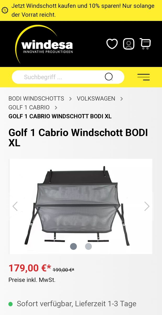 Da ich mein Cabrio nicht offen ohne Windschott bewegen kann ohne Tage hinterher mit übelsten Nackenschmerzen zu kämpfen, hab ich hier jetzt zugeschlagen. Das alte in die Tage gekommene Windschott hat somit ausgedient.