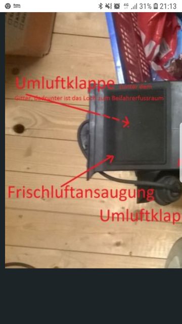 Bei den Wasserablauf im Motorraum ist der Ansaugkasten für das Gebläse. An diesem sitzt eine Klappe die durch eine Unterdruckklappe öffnet oder schließt.