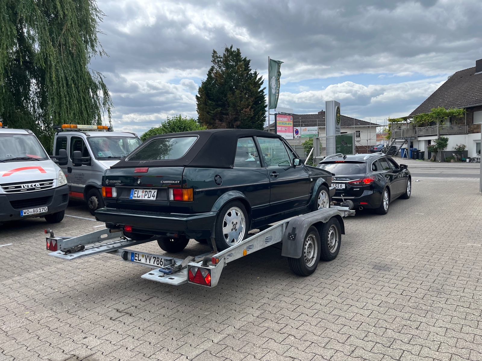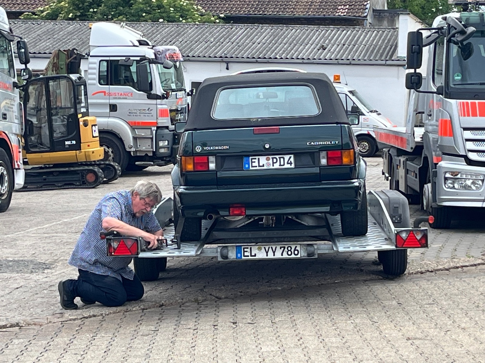 Zwei Tage später konnte ich mit meinem Autofreund und Kfz-Meister das Cabrio huckepack mit einem Trailer abholen (450 km).