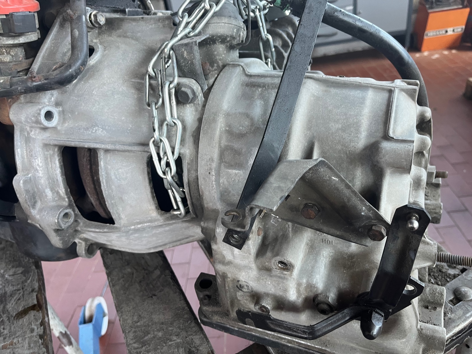 Der Motor wird eingebaut, sobald die Spedition ihn zur Werkstatt geliefert hat.