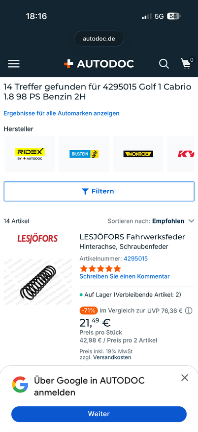 Die Feder merke ich mir. Kosten minimal und unter 600 hört sich gut an. Wirst ja keine schweren Diesel fahren 😄